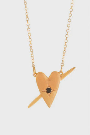 Zoom A gold-plated necklace with a heart-shaped pendant featuring a small faceted stone, displayed against a white background.