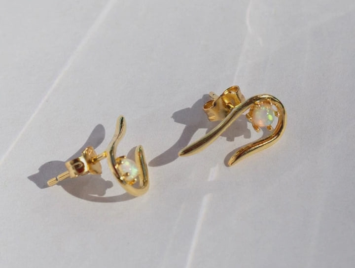 These delicate opal stud earrings are designed to be worn two ways - turn them up or down along your ear for a versatile look that's uniquely yours. The Kai Studs feature a beautiful lab-grown opal stone that catches the light with every movement, perfect for everyday wear or layering with other earrings. Crafted with 18k gold plating over sterling silver, these elegant studs measure approximately 1/2" in length. We chose lab-grown opal for these small settings for its superior durability and color stability, unlike natural opal, which is soft and prone to cracking and color changes, making these studs perfect for daily wear.