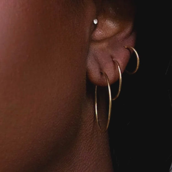 Endless Hoops are here! Endless hoops, also known as infinity or sleeper hoops were made for your comfort! The thin 1mm thickness of the hoop allows for a lightweight feel that our customers are going to love. The 12mm hoops are the perfect size for someone who doesn't like a lot of fuss. The hinge where the ear hook meets the hoop allows you to easily take your hoops on and off while minimizing any bulkiness.